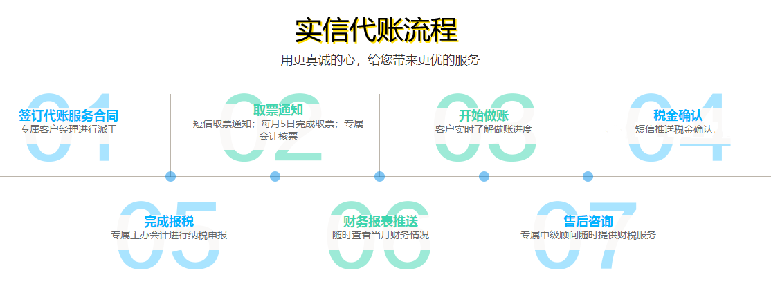 簽訂代賬服務(wù)合同專屬客戶經(jīng)理進(jìn)行派工 資料提交每月5日前完成 開始做賬 客戶實(shí)時(shí)了解做賬進(jìn)度 稅金確認(rèn)